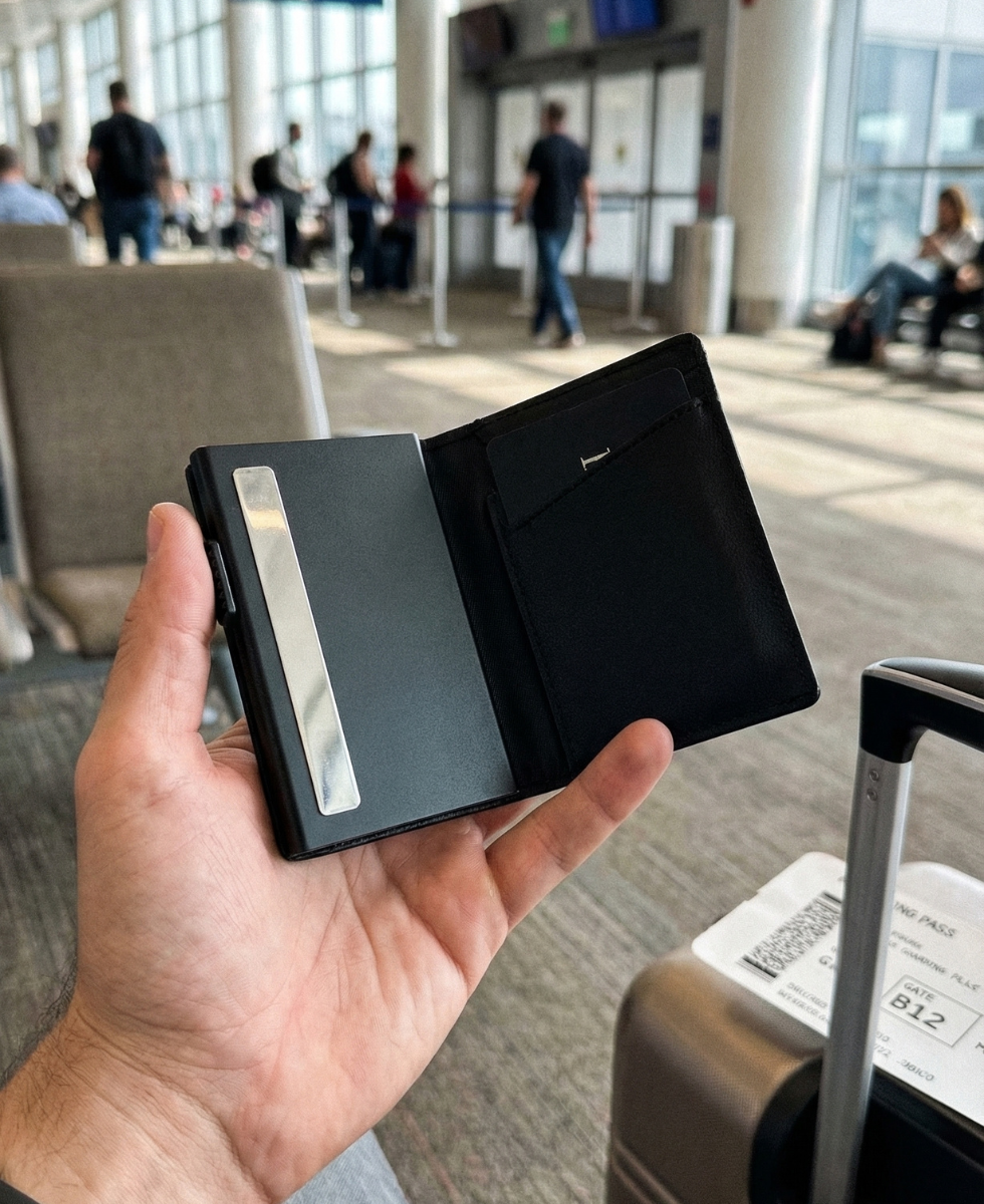 Tarjetero minimalista de cuero y aluminio. Con capacidad para 5 tarjetas en la cajita de aluminio y 5 tarjetas/ documentos en los demás compartimentos.