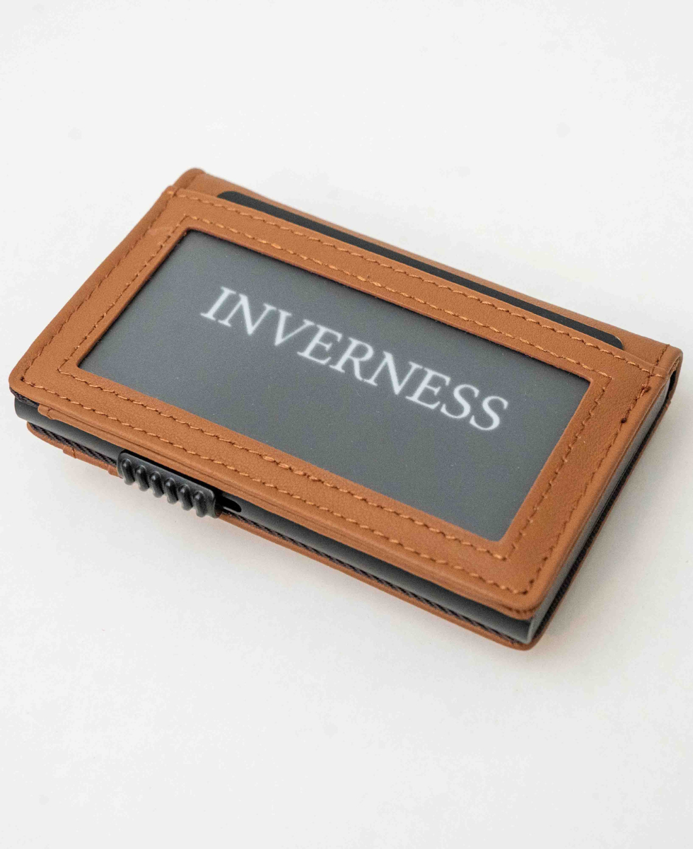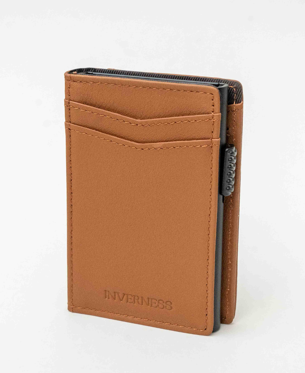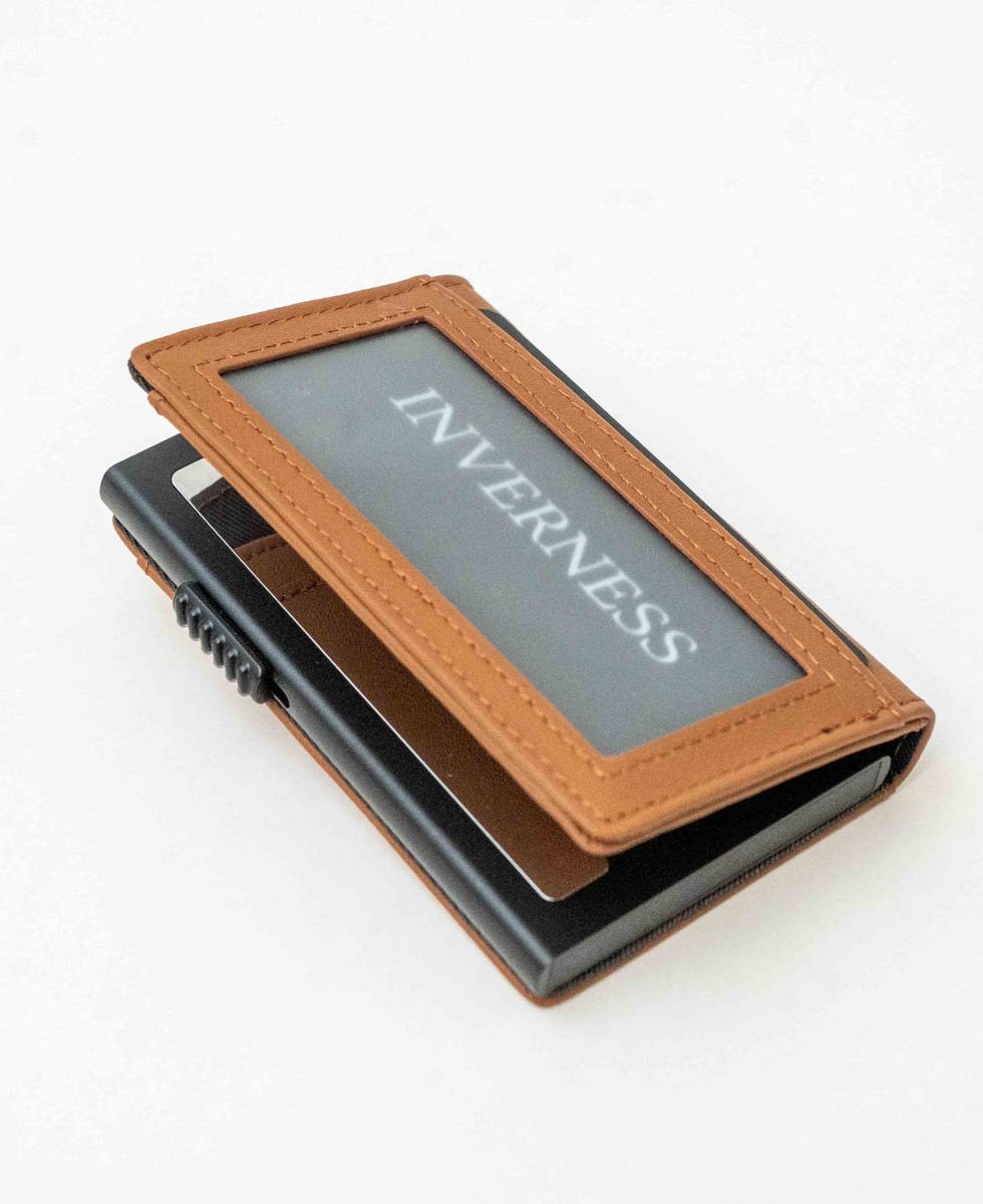 Tarjetero de cuero y aluminio.